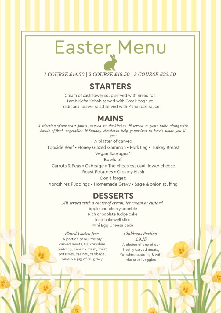 A Family Feast: A selection of roast joints (Beef, Gammon, Pork, Turkey, or Vegan Sausages) carved in our kitchen and served with all the Sunday classics.